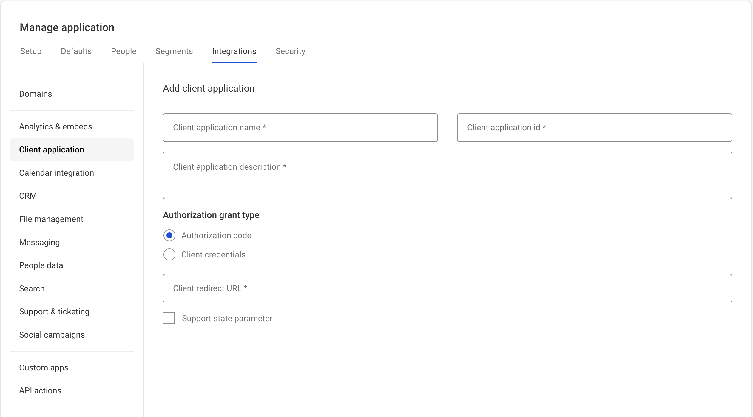 - Client redirect URL—The URL the browser will redirect back to after successful authorization. You will receive an authorization code that can be exchanged to get access token